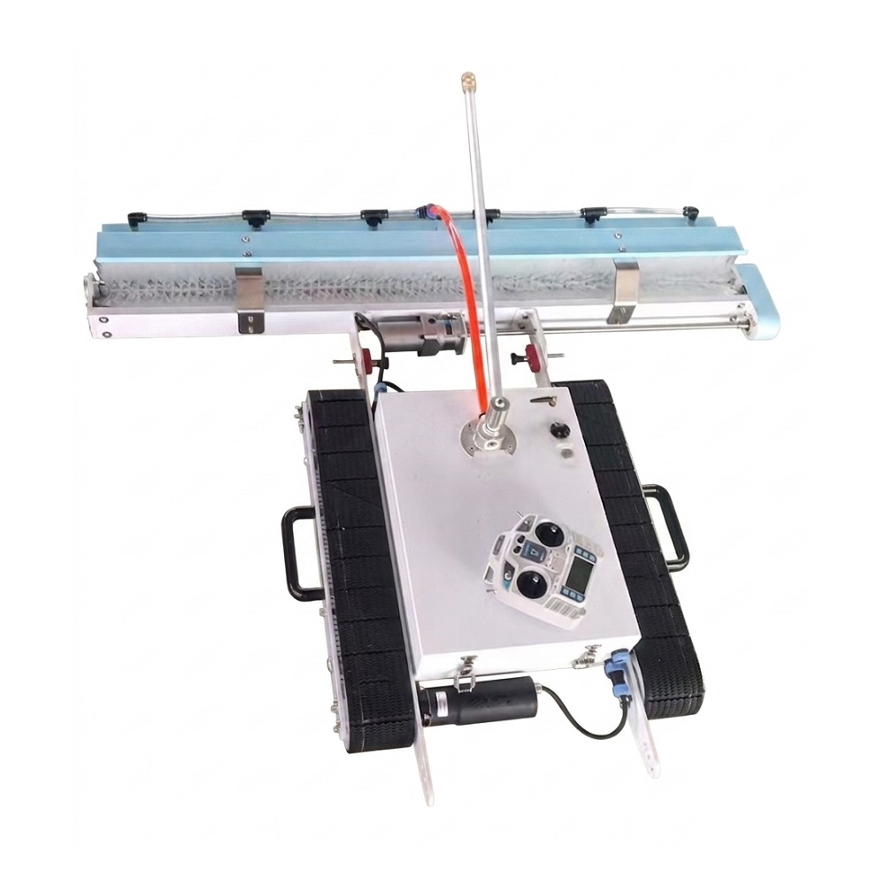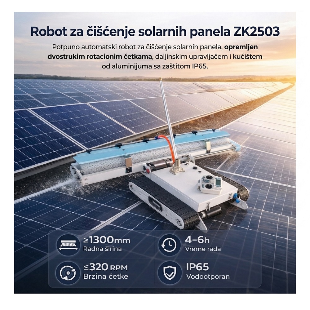 Profesionalni automatski robot za čišćenje solarnih panela, namenjen za brzo, efikasno i bezbedno održavanje solarnih elektrana, krovnih sistema i velikih fotonaponskih površina. Robot je opremljen gumenim gusenicama visoke prijanjivosti, širokom rotacionom četkom i sistemom za suvo i mokro čišćenje, što omogućava uklanjanje prašine, peska, lišća, polena i drugih nečistoća sa površine panela. Uređaj se upravlja putem daljinskog upravljača dometa do 100 metara, što omogućava jednostavno korišćenje i na većim instalacijama.