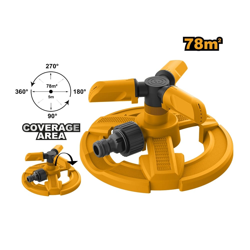Napravljena je od izdržljive ABS plastike, što je čini laganom, ali otpornom na spoljne uticaje. Poseduje standardni adapter od 3/4″ za brzo i jednostavno povezivanje sa baštenskim crevom. Ugao mlaznica na krakovima je podesiv, što vam omogućava da precizno odredite domet i intenzitet prskanja, sa maksimalnim radijusom od 6 do 8 metara, zavisno od pritiska vode.